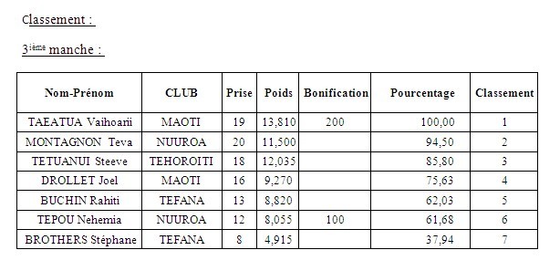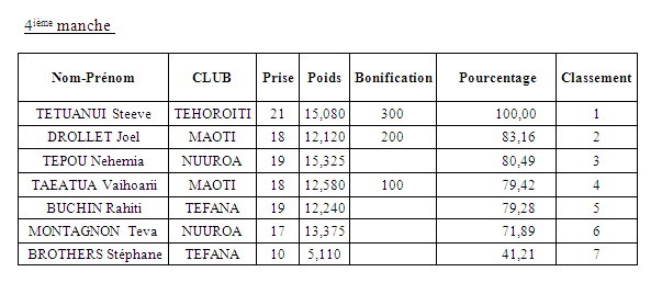 Teva Montagnon et Rahiti BUCHIN font le circuit inverse et, au final, presque que tous les pêcheurs affichent près de 19 prises. Les bonifications allaient faire la différence. Steeve sera le seul à passer la basse des 20 prises mais malgré 3 bonifications, cela ne sera pas suffisant pour détrôner Tepou, qui remporte encore le titre. On ne saura trop le dire, la pêche est un sport d’expérience et au-delà de la forme physique, la connaissance du biotope jour un rôle primordial dans la quête de poisson.