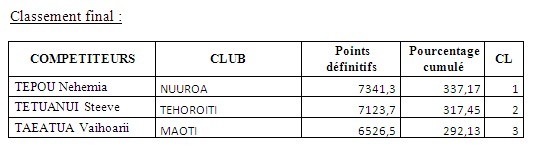 Tepou NEHEMIA, champion 2013, partait avec une bonne avance car il s’était classé dans les 2 premiers durant les premières manches mais la concurrence est rude pour le titre et beaucoup de prétendants, en phase de préparation pour les mondiaux, se sont présentés avec pour objectif de réussir à le battre.