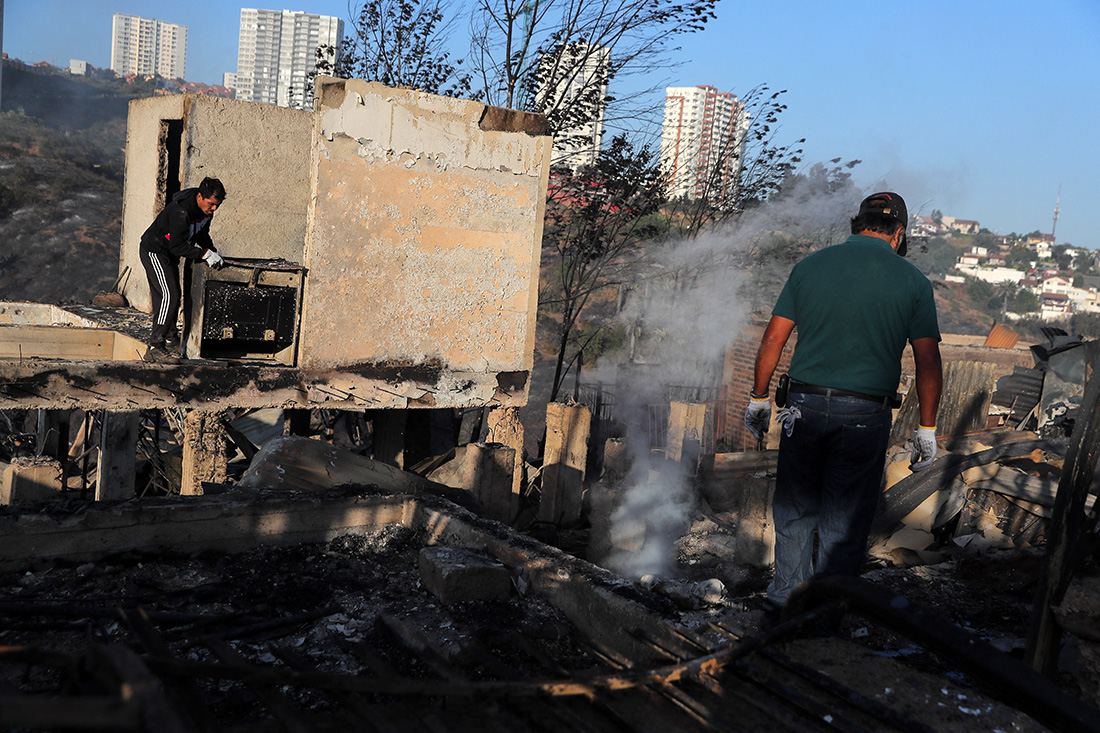 "Environ 200 logements brûlent", avait indiqué le commandant des pompiers de la ville, Patricio Brito, avant de revoir le nombre à 400 et de confirmer la mort de deux personnes dans l'incendie.