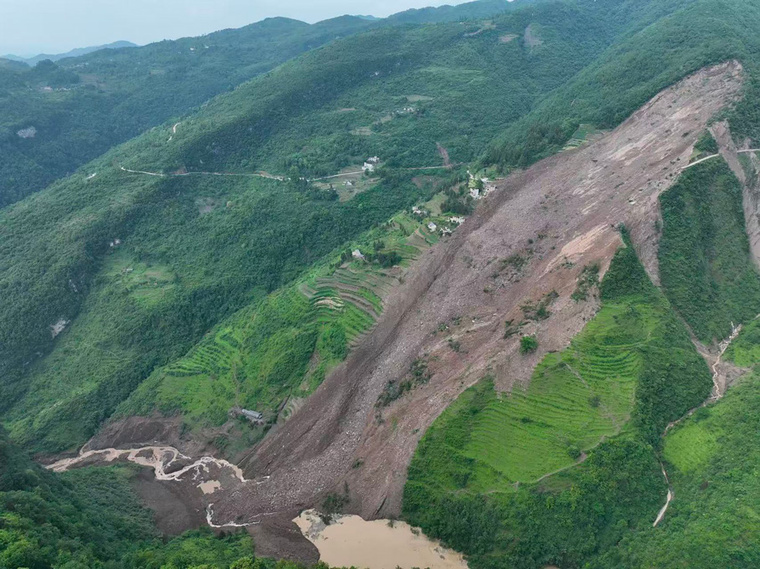 Des images aériennes diffusées par CCTV montrent un village dévasté par une coulée de boue brunâtre qui a recouvert des champs agricoles avant de s'accumuler au pied d'une montagne.
