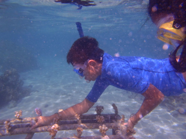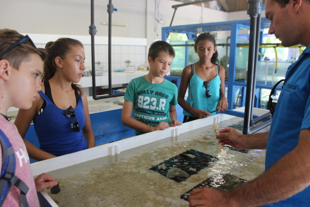 Présentation de l'écostation et des recherches scientifiques en cours ("Post Larval Capture", "Bouturage des coraux" par le Criobe et "acidification des océans " par l'université de Washington).