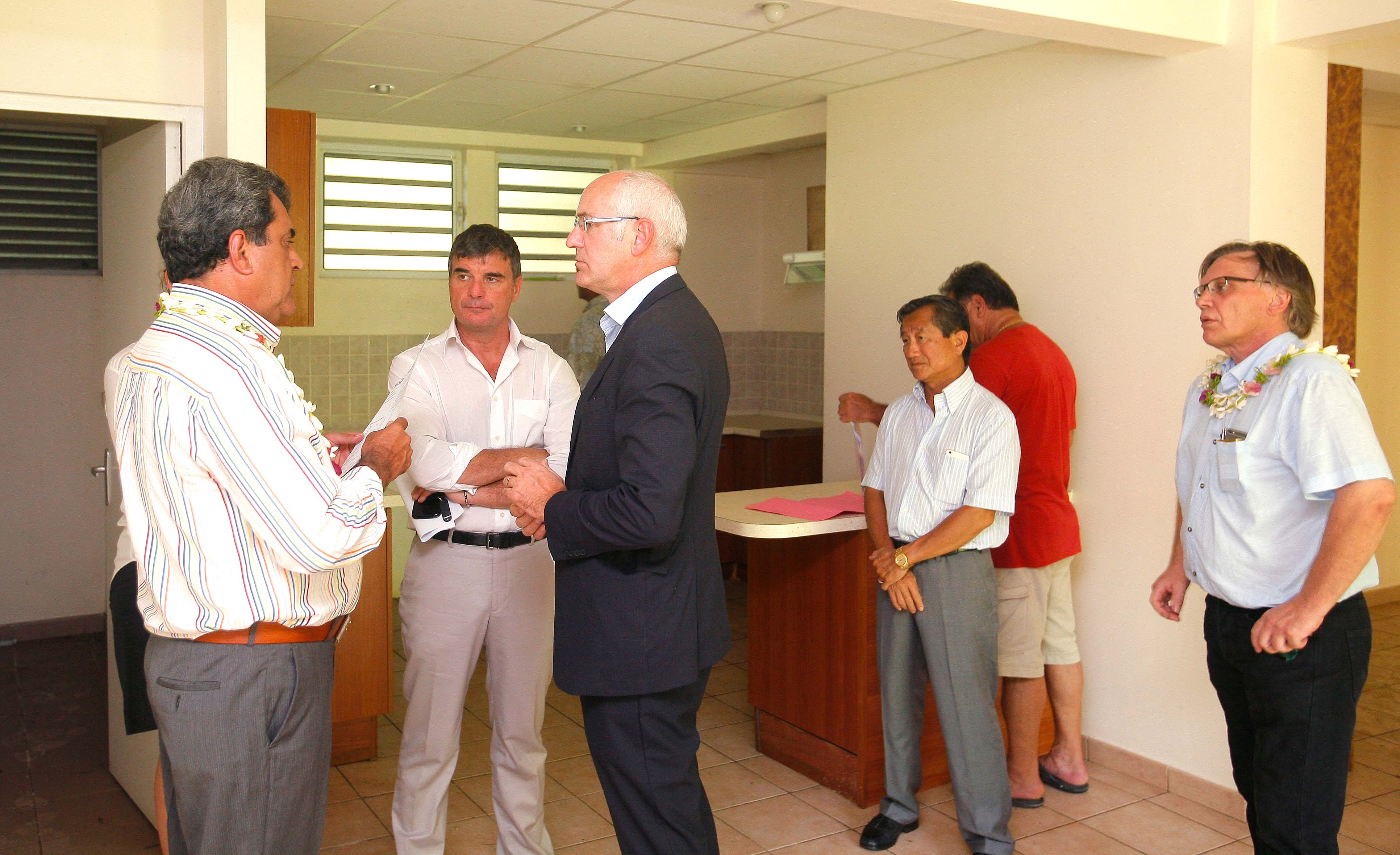 PIRAE, le 11 novembre 2015. Le président Edouard Fritch, accompagné du ministre du logement Tearii Alpha, a accueilli ce mercredi après-midi Thierry Repentin, délégué interministériel national à la mixité sociale dans l’habitat, sur le site de la cité Grand à Pirae. Depuis juillet 2013 ces anciens logements des militaires sont tous entièrement inoccupés