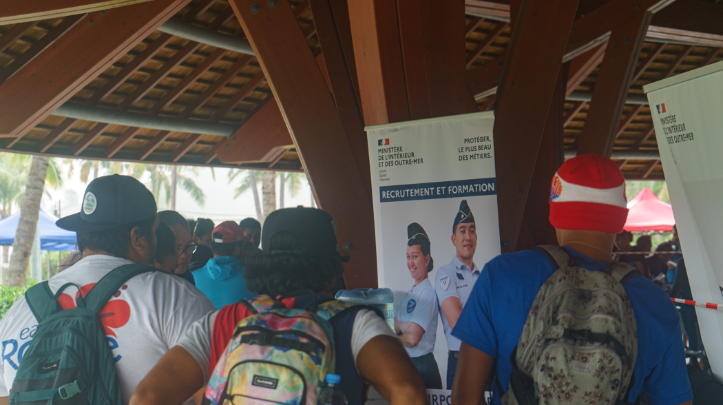 Ce vendredi 19 juillet, la FOL et Tu’aro Nui ont tenu une journée de cohésion pour ces jeunes bénévoles, au parc Tahua du motu Ovini, à Faa’a. “Une journée divisée en deux parties”, explique Tiare, coordinatrice de la journée de cohésion. “Le matin, un carrefour des métiers et cet après-midi, des jeux traditionnels.” Une journée pour apprendre à se connaître avant de travailler dans ces fanzones, mais aussi une journée qui permet d’étoffer son projet professionnel pour la suite, en rencontrant plusieurs corps de métier ayant fait le déplacement. RSMA, armée de l’air, marine, police nationale, CFPA, service civique… Plusieurs stands ont répondu aux questions de ces jeunes sur les métiers, formations et démarches nécessaires pour y prendre part. “La plupart des intervenants qu’on a fait venir proposent des formations diplômantes, qualifiantes et professionnelles”, explique Tiare, afin que ces jeunes, certes bénévoles, puissent entrouvrir la porte du marché du travail.