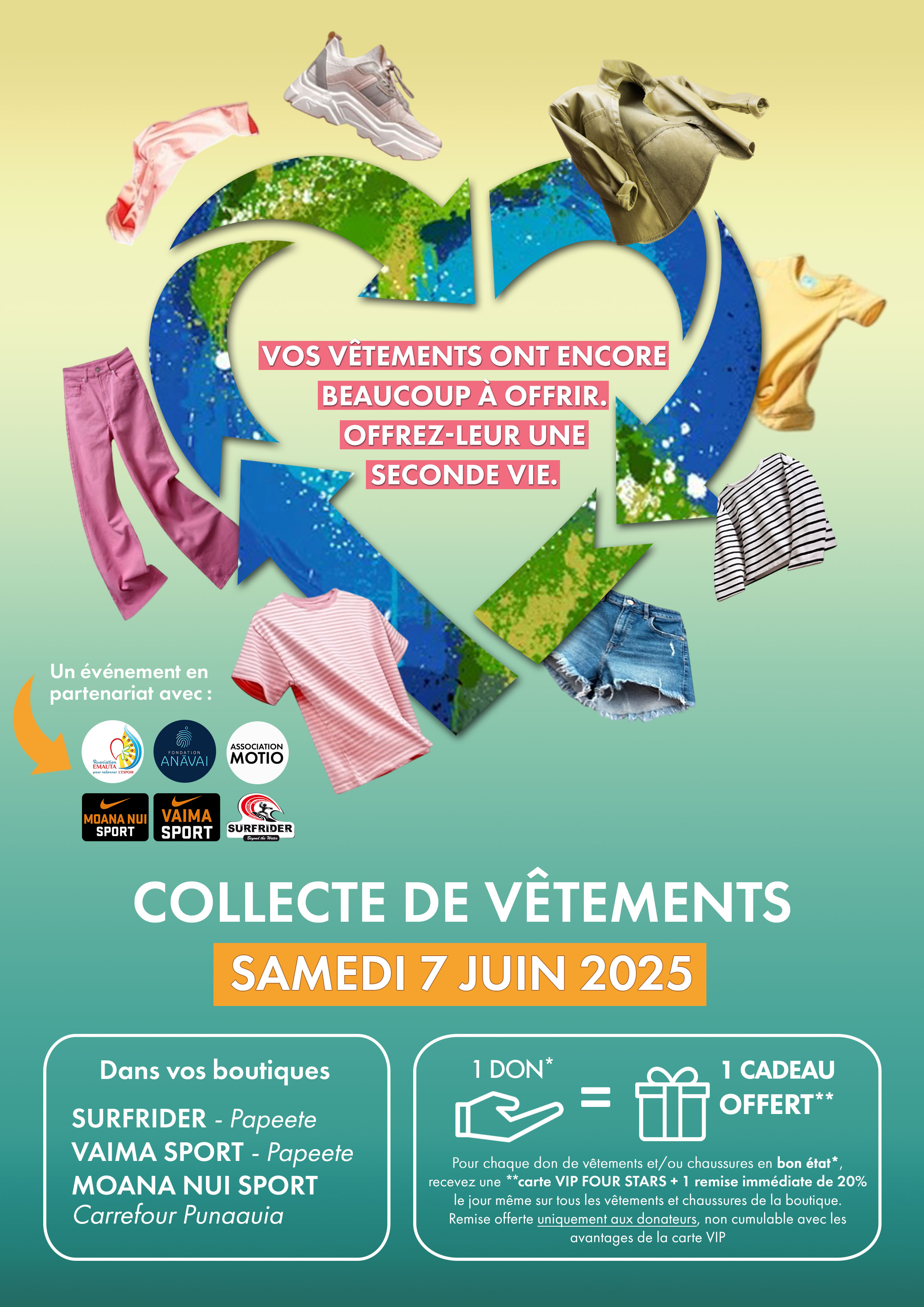 Tahiti le 2 juin 2025. Samedi 7 juin, une collecte de vêtements est organisée dans les boutiques Surfrider, Vaima Sport et Moana Nui Sport dans la galerie marchande de Carrefour Punaauia.
