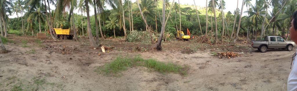 C’est une entreprise locale qui a obtenu le marché pour une durée de 3 mois nous explique Sylvana Estall, gardienne du terrain où les travaux ont commencé. Elle raconte comment plusieurs centaines de cocotiers seront récupérés puis broyés avant d’être retirés. Le terrain sera remblayé à hauteur de 1 mètre au-dessus du niveau de la mer.