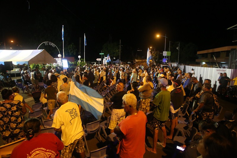 Mais cette fois, l'ambiance était tout de même à la fête, au vu des excellents résultats du Tavini aux dernières législatives. Le public, près de 300 personnes, vêtu de bleu et blanc, a repris les chants en chœur, sourires aux lèvres, tapant des mains et brandissant les drapeaux aux cinq étoiles. Le cortège parti de la mairie a pris place peu après 18 heures face à l'estrade installée devant la stèle, où des gerbes ont été déposées.