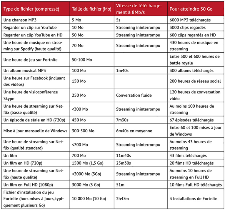 Vous aurez aussi droit à une consommation de 30 Go, 60 Go ou 120 Go par mois, illimité de minuit à 6h du matin. Le tableau ci-dessous vous permet de voir ce que représentent 30 Go de données… Et ce qu'il vaut mieux prévoir de lancer la nuit (télécharger un jeu complet par exemple).