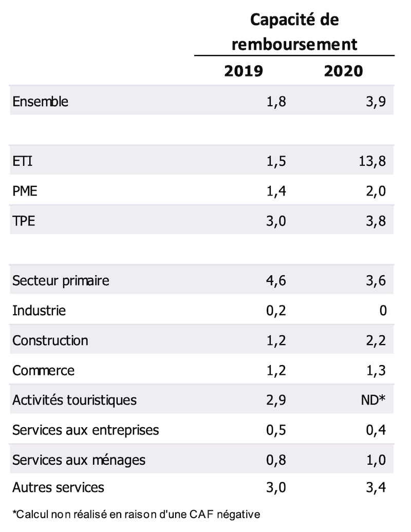 Reste un bémol à cette situation, la “capacité de remboursement” des entreprises a été affectée par la crise sanitaire. Cet indicateur qui mesure le nombre d'années nécessaire pour qu'une entreprise soit en mesure de rembourser sa dette a fait plus que doubler en passant de 1,8 an à 3,9 ans. Dans les entreprises de taille intermédiaire, la situation est particulièrement criante. La “capacité de remboursement” passe de 1,5 an à 13,8 ans entre 2019 et 2020.