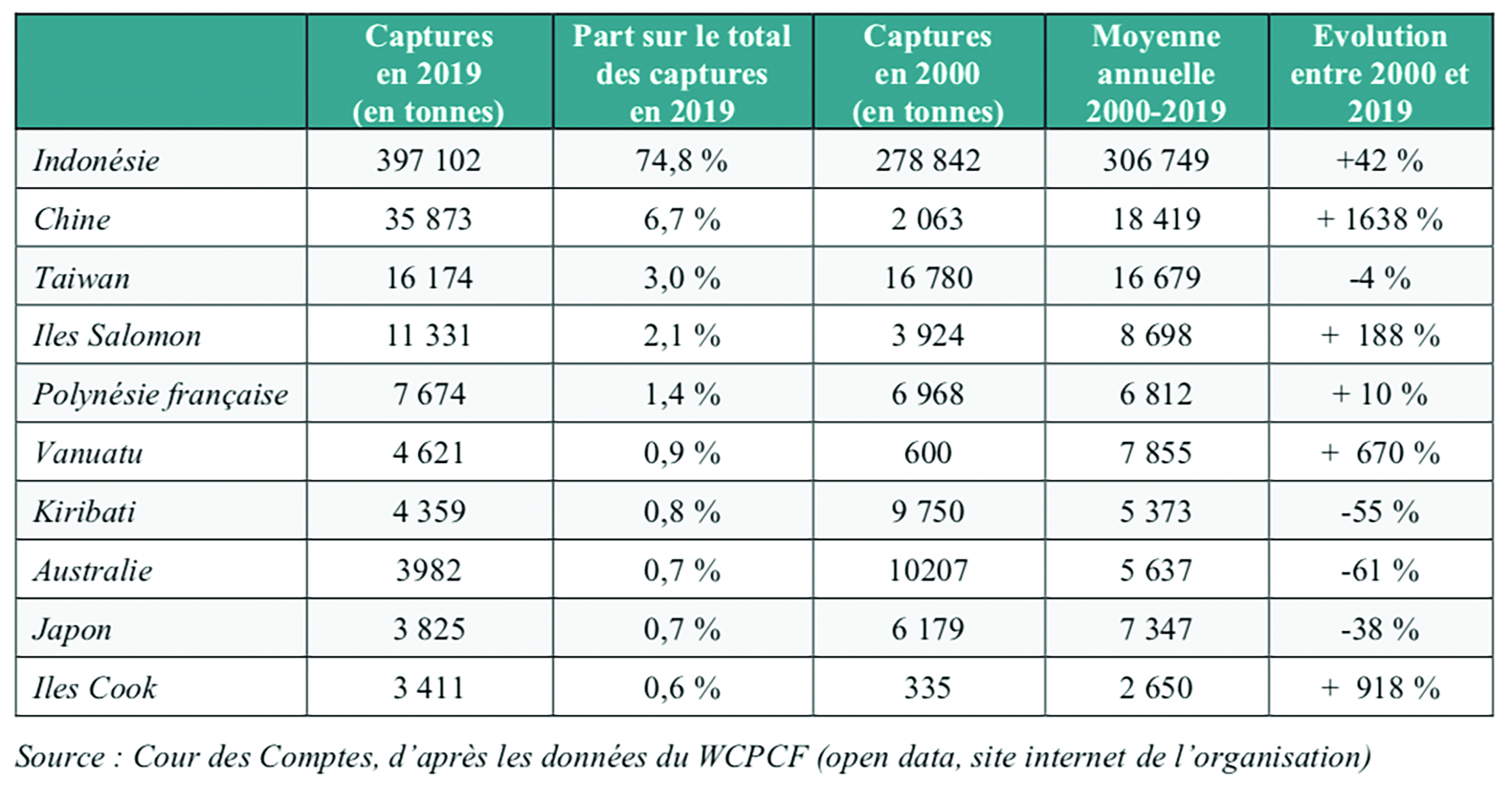Le rapport de la Cour des comptes dresse un état des lieux à la fois assez effrayant de l'activité de la pêche dans le Pacifique et particulièrement rassurant sur l'état de la pêche dans la vaste ZEE de la Polynésie française. Depuis 2000, le tonnage moyen annuel de capture du thon dans le Pacifique sud-est de 429 249 tonnes, en hausse continue depuis 20 ans. En 2019, ces volumes ont atteint 530 940 tonnes.