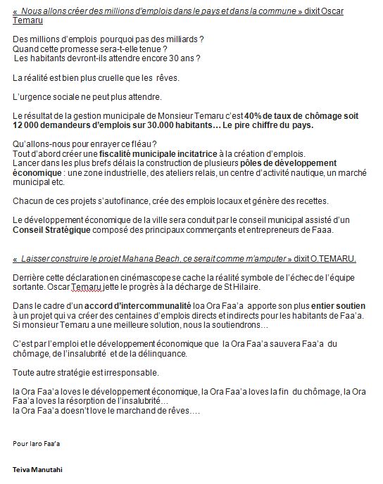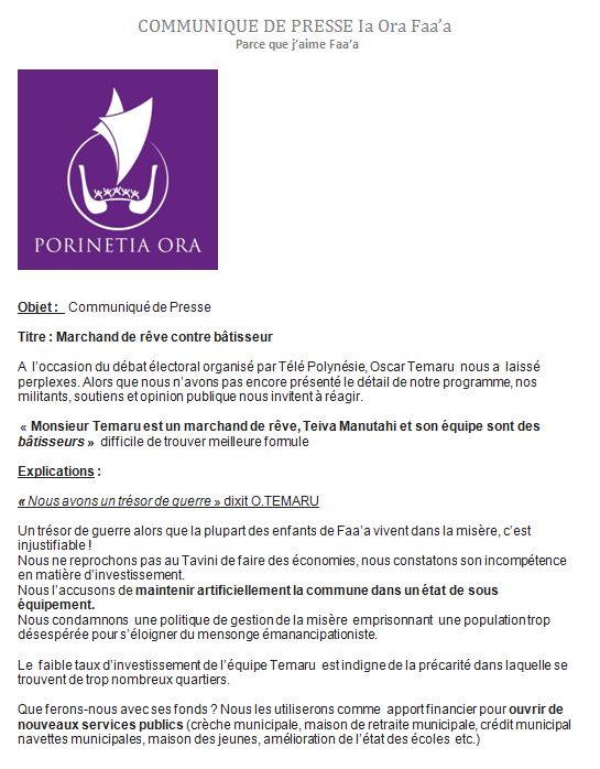 Communiqué de Teiva Manutahi relatif aux déclarations publiques de Monsieur Oscar Temaru