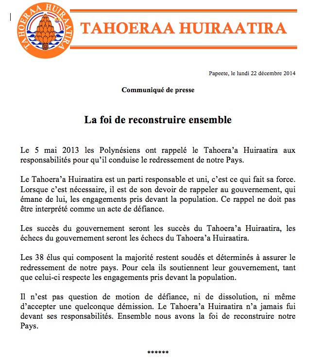 Communiqué du Tahoeraa: la foi de reconstruire ensemble