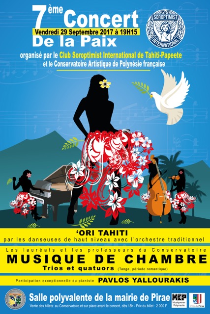 PAPEETE, le 22 septembre 2017 - Le concert de la Paix, donné le vendredi 29 septembre à 19h30 dans la grande salle de la mairie de Pirae, sera le 13e gala organisé conjointement par le Conservatoire artistique et le Club caritatif Soroptimist International Tahiti/Papeete. Il mettra en scène 40 artistes qui offriront de la danse traditionnelle et de la musique de chambre. Les recettes de ce concert caritatif financeront les études artistiques de jeunes élèves méritantes mais défavorisées.