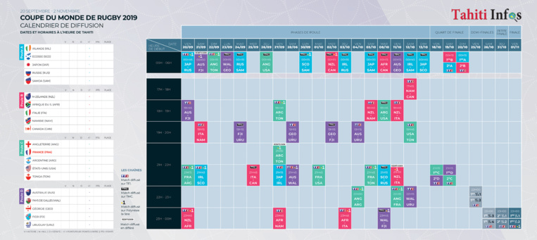 Le Japon lance "sa" Coupe du monde, vendredi (19h45 heure locale/ cette nuit à 00h45 heure de Tahiti), face à la Russie. 48 matchs attendent les amateurs du ballon ovale, jusqu'à la finale le 2 novembre. Découvrez le programme complet des retransmissions TV à l'heure polynésienne.