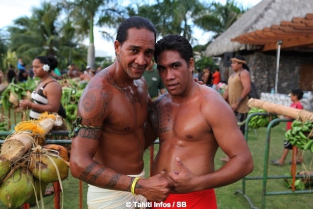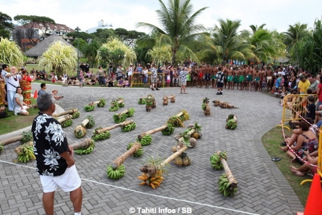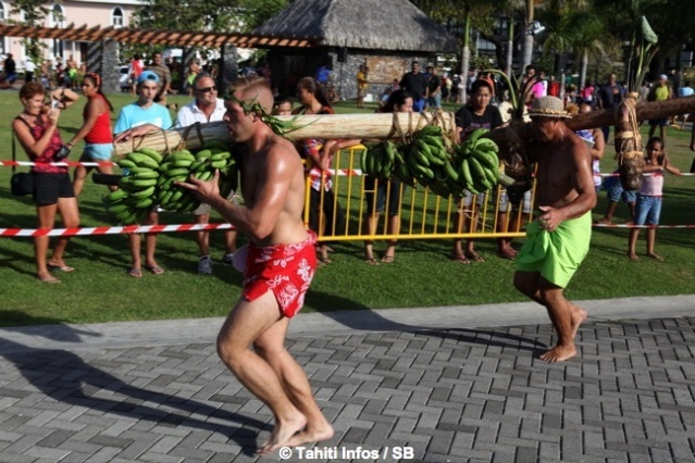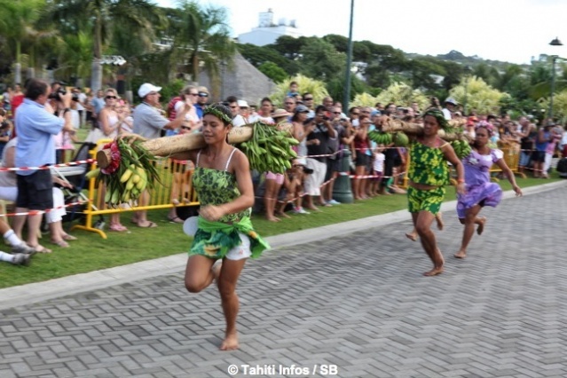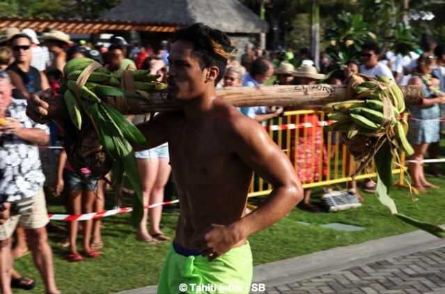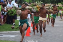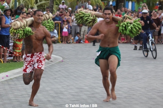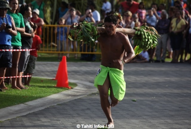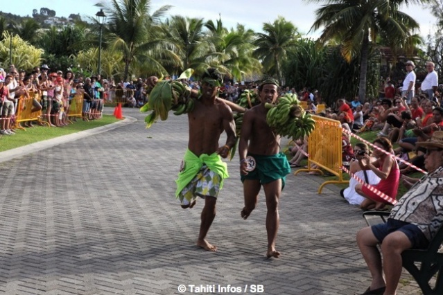 Mardi 16 juillet 2013. C’est devant une foule conséquente que les courses de porteurs de fruits ont eu lieu dans les jardins de Paofai à Papeete mardi après midi. 6 catégories étaient en lice. Moana Mairau termine premier de la catégorie ‘aito’ (charge de 50 kg) mais suite à une pénalité la première place est attribuée également à Samuel Teinauri le tenant du titre, ils terminent donc 1ers ex-aequo de la catégorie reine.