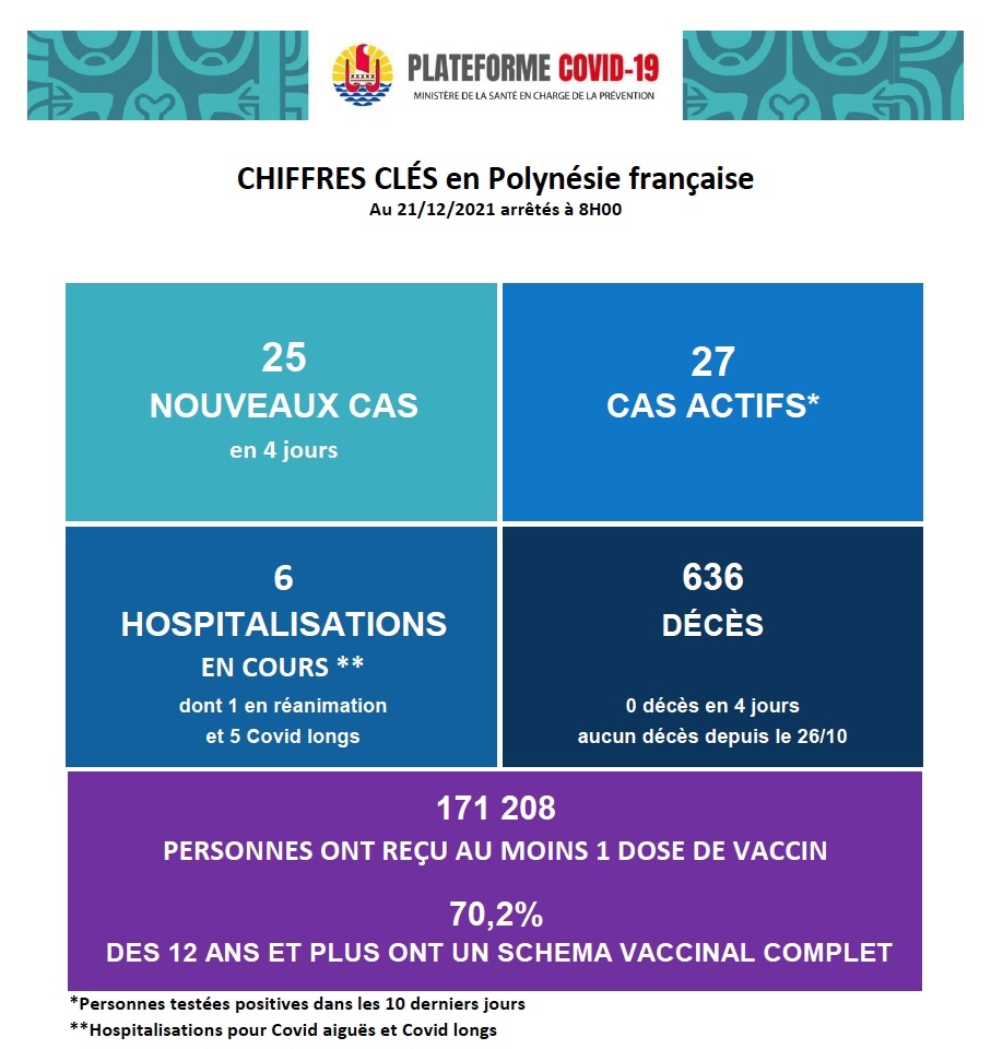 Tahiti, le 21 décembre 2021 – Le dernier point épidémiologique de la plateforme Covid-19, communiqué mardi matin fait état de 27 cas actifs dont 25 nouveaux cas testés positifs au cours des quatre derniers jours en Polynésie française. À noter que ces chiffres n'incluent pas les cas importés (voyageurs). Six malades sont actuellement hospitalisés au CHPF du Taaone, dont un en réanimation, les autres sont traités pour Covid long. Aucun décès n'est à déplorer depuis le 26 octobre au fenua. Du côté de la vaccination, à présent, 70,2% de la population présente un schéma vaccinal complet.