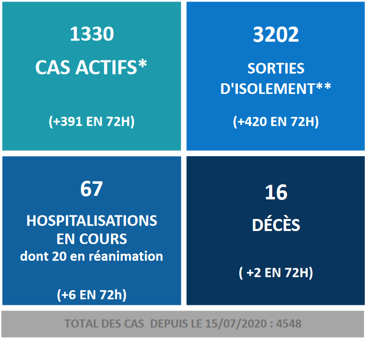Tahiti, le 19 octobre 2020 - Progression significative de la maladie ce lundi, alors que la direction de la Santé enregistre 391 cas actifs depuis vendredi pour un total de 1 330 cas actifs aujourd'hui. Les autorités sanitaires enregistrent également 420 sorties d'isolement pour un total de 3 202 personnes guéries. Au passage, le nombre d'hospitalisations poursuit sa hausse, avec six nouvelles hospitalisations ces dernières 72 heures pour un total de 67 hospitalisations en cours, dont 20 en réanimation, contre dix vendredi. Enfin, deux décès supplémentaires liés à la Covid-19 sont à déplorer ce lundi. Au total, 4 548 cas ont été enregistrés depuis l'ouverture des frontières le 15 juillet.