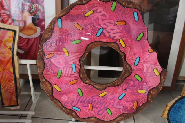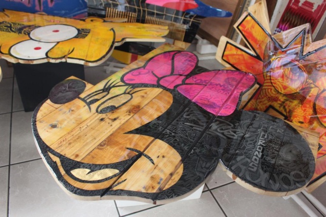 “J’ai déjà fait quelques œuvres sur bois de palette, mais c’est la première fois que je fais une exposition qui ne présente que des œuvres de ce genre”, explique l’artiste Cronos. “Je cherchais un support original et celui-ci me plaît car j’aime le travail manuel, la menuiserie.”