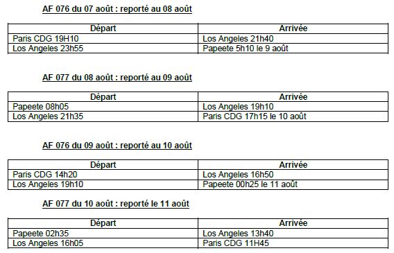 Le vol Paris – Papeete AF 076 du jeudi 07 août est ainsi reporté au vendredi 08 août, et par effet domino les vols suivants sont également décalés d’un jour à chaque fois. Dans le détail :
