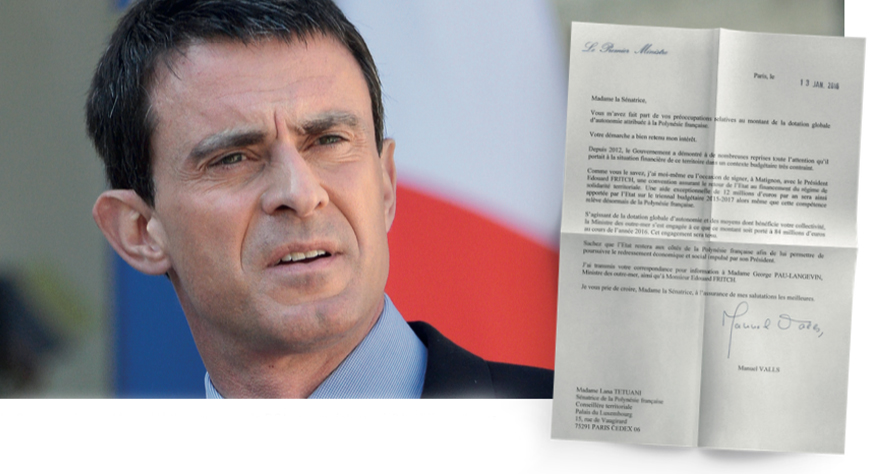 "S’agissant de la dotation globale d’autonomie et des moyens dont bénéficie votre collectivité, la ministre des outre-mer s’est engagée à ce que ce montant soit porté à 84 millions d’euros au cours de l’année 2016. Cet engagement sera tenu", assure Manuel Valls dans un courrier adressé aux sénateurs polynésiens, en réponse à la question écrite qu’ils avaient cosignée début décembre, à l’adresse du Premier ministre.