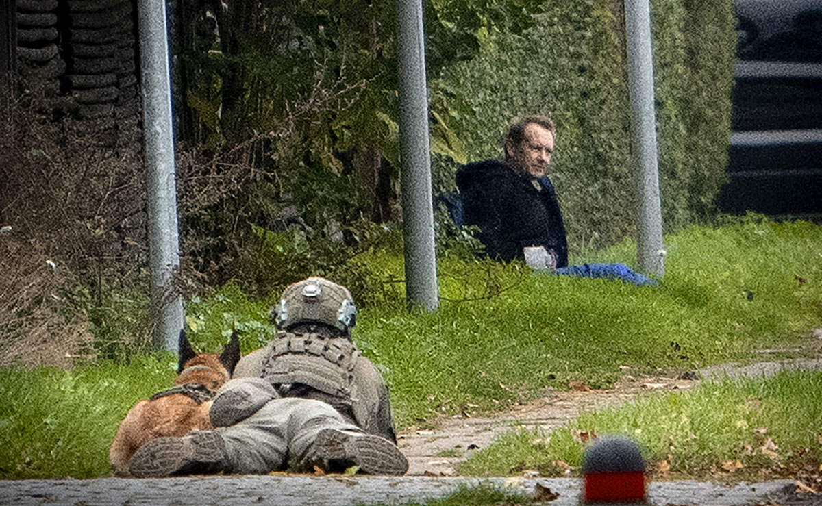 Il n'a toutefois pas été immédiatement arrêté : avant son interpellation, il est longtemps resté assis dans l'herbe et adossé à une rangée d'arbres, cerné par deux policiers allongés sur le sol, armes pointées sur lui, peut-on voir sur les images diffusées par les médias.