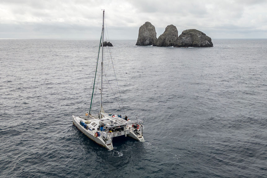 Colombie | AFP | mardi 14/10/2024 - Tel un petit point blanc au pied de l'imposante rocaille, au beau milieu de l'immensité du Pacifique, un catamaran patrouille dans les eaux de Malpelo.