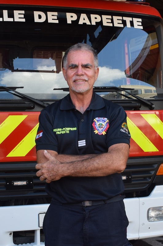 “J’ai commencé en 1979 en tant que pompier de Paris. Là-bas, j’ai connu des interventions qu’on ne voit pas ici, comme des suicides sur voies ferrées ou des incendies dans des grands dépôts d’hydrocarbures. Puis j’ai été obligé de rentrer à Tahiti pour des raisons familiales. J’ai d’abord travaillé à l’aéroport de Tahiti mais il n’y avait pas assez d’action pour moi. Je suis sur Papeete depuis 1987. Cette année-là, il y a d’ailleurs eu les grandes émeutes, il y avait des feux de partout, cela m’a marqué. J’ai ensuite gravi les échelons. J’ai été chef de corps volontaire pendant cinq ans sur la commune de Teva i Uta. Aujourd’hui, je suis chef de corps à Papeete, c’est-à-dire que j’organise mon service aussi bien au niveau du personnel que de l’administratif.”