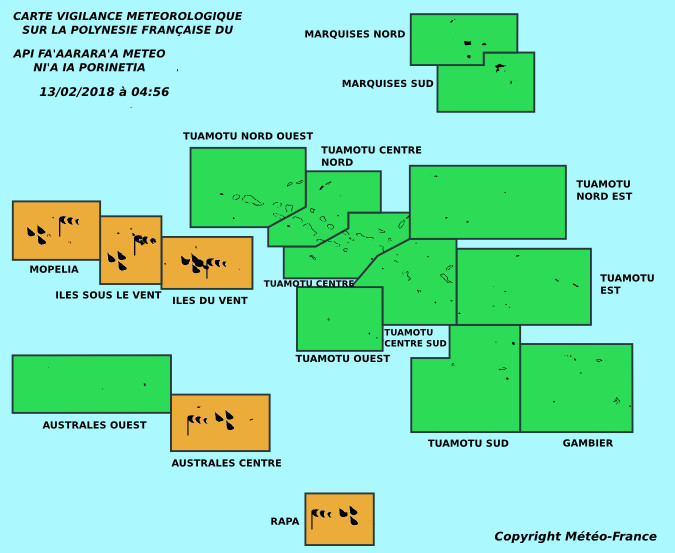 PAPEETE, le 13 février 2018. De fortes pluies sont encore attendues ce mardi sur le fenua. L'archipel de la Société a été placé en vigilance orange « fortes pluies » et vigilance jaune « vents violents ». Les Australes sont en vigilance orange « vents violents » et vigilance jaune « fortes pluies ».