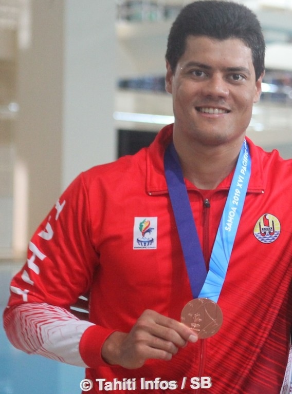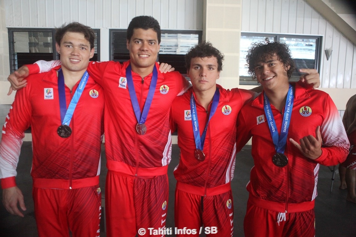 APIA, le 11 juillet 2019 - Rahiti De Vos sur 200 m nage libre et le relais 4x100 m masculin ont rapporté deux médailles d'argent à la délégation tahitienne ce jeudi à Apia. Poerani Bertrand et Teiki Dupont ont de leurs côtés décroché deux médailles de bronze respectivement sur le 50 m brasse et le 100 m dos.