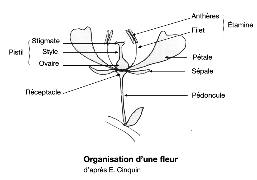 La fleur est constituée de plusieurs pièces florales insérées sur un réceptacle. Il y a ce qu’on appelle des sépales qui sont souvent de couleur verte. Les pétales, eux, sont très colorés pour attirer insectes et oiseaux pollinisateurs. Parmi les insectes pollinisateurs il y a les abeilles, les mouches, les guêpes, les papillons, les fourmis… Parmi les oiseaux pollinisateurs on trouve les colibris ou les passereaux. La fleur est également composée d’étamines. Il s’agit des parties mâles dont les anthères produisent le pollen. Enfin se trouve le pistil, la partie femelle de la fleur qui est composée des ovaires surmontés du style et du stigmate où se dépose les grains de pollen.