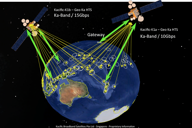 Le projet de Kacific. Un seul satellite sera lancé pour l'instant : départ prévu en 2018.