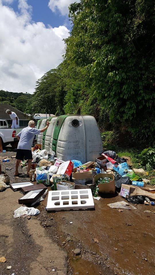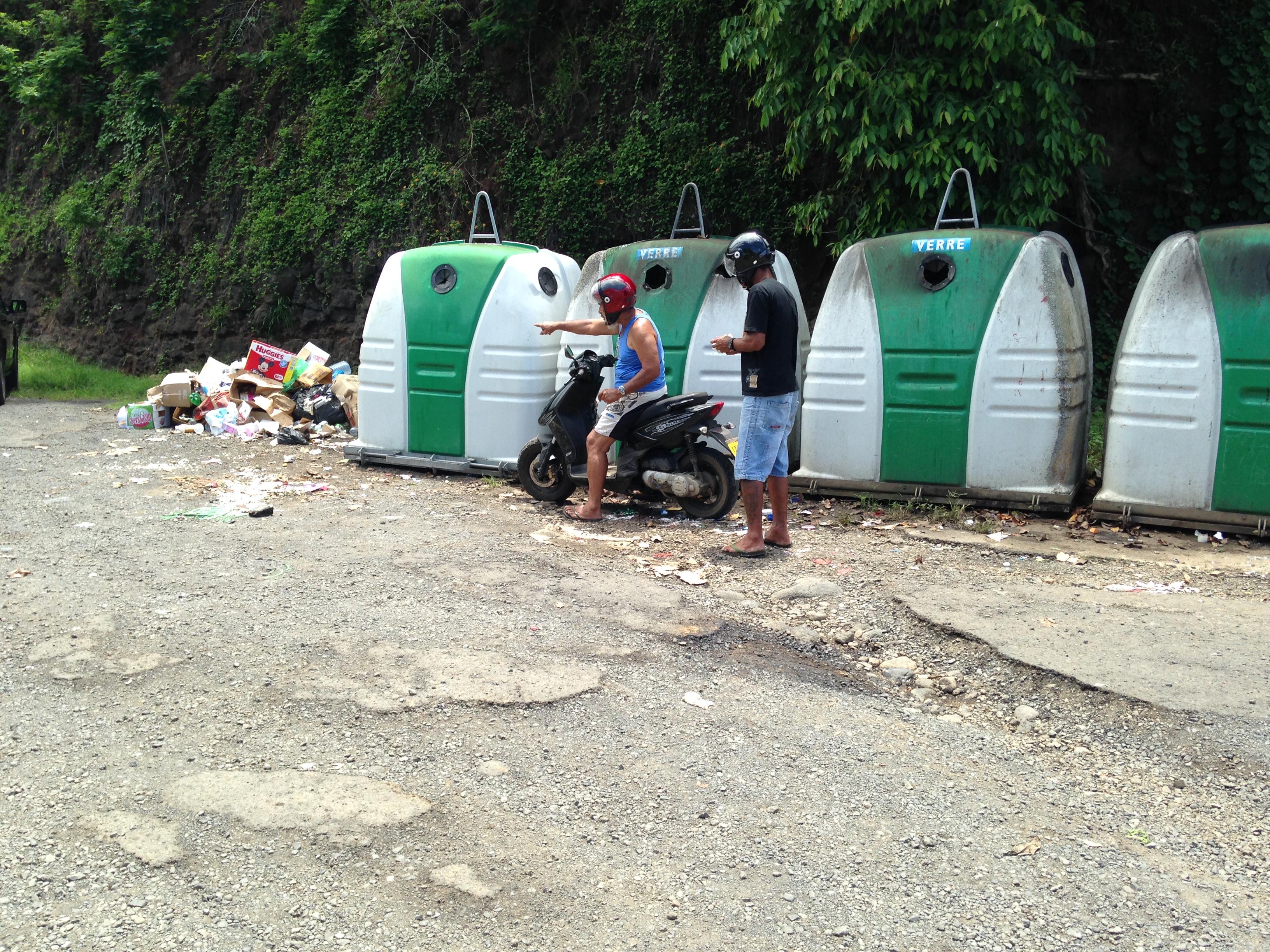 MAHINA, le 28/12/2015 - En ces périodes de fêtes, les déchets se multiplient par deux et des mini dépotoirs voient le jour. Le week-end de noël n'échappe pas à la règle, sur les réseaux sociaux, une photo des bacs à verres à Mahina fait le buzz. Des cartons remplis de bouteilles de verres et des déchets en tous genres ont été déposés parterre. Pour la mairie, ce comportement est inadmissible.