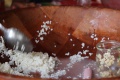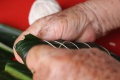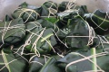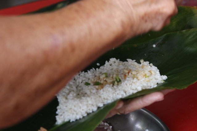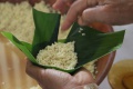Le riz doit tremper une journée et une nuit. Ensuite, il est compacté dans des feuilles de auti préalablement congelées pour les ramollir. "On glisse une brindille de ce qu’on appelle le soomoo1 avant de fermer", précise Germaine Chung. De la ficelle de cuisine permet de maintenir les tsungs emballés.