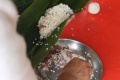 "On rince un paquet de riz gluant que l’on met à tremper dans de l’eau avec un demi verre d’Elye water", explique-t-elle. Une poignée de feuilles de goyaviers infusée permet de colorer le riz.