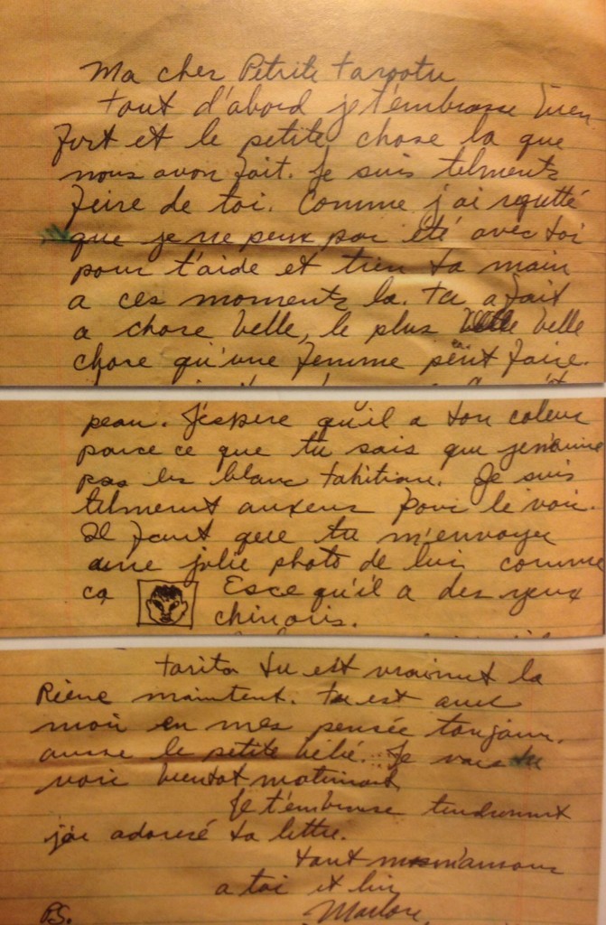 " Tu es avec moi, en mes pensées toujours, avec le petit bébé." Le merveilleux site "Deslettres" est à découvrir. On y trouve quantité de perles rares dont une des plus belles est cette lettre écrite par Marlon Brando à sa jeune épouse tahitienne, Tarita, rencontrée sur le tournage des "Révoltés du Bounty". Cette lettre, écrite en français par l’acteur et envoyée deux mois après la naissance de leur fils Teihotu, révèle sa joie à l’arrivée du bébé et sa hâte de retrouver sa femme et leur enfant.