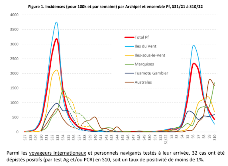 Tahiti, le 17 mars 2022 – Dans son bulletin épidémiologique hebdomadaire, la Plateforme Covid-19 rapporte que, pour la quatrième semaine consécutive, le nombre de nouveaux cas confirmés de Covid en Polynésie est en diminution. Si la décroissance de l'épidémie se poursuit aux îles du Vent et dans les autres archipels, elle demeure cependant encore très élevée aux Marquises.