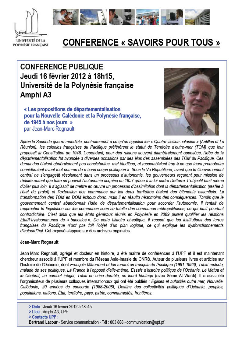 Dans le cadre des conférences gratuites "Savoirs pour tous", l'Université de Polynésie française ouvrira ses tribunes à l'historien Jean-Marc Regnault qui présentera les propositions de départementalisation pour la Nouvelle-Calédonie et la Polynésie française de 1945 à nos jours
