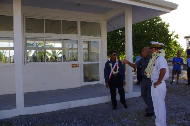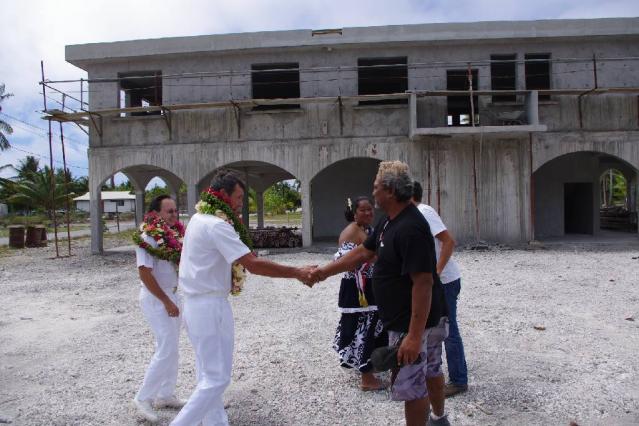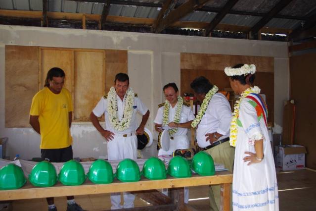 La délégation s’est ensuite rendue sur le chantier de l’école primaire. Ce chantier de plus de 3000m2, qui a permis l’embauche d’une vingtaine de personnes dont 15 habitants de l’atoll, fait l’objet d’un financement du Fonds Intercommunal de Péréquation (FIP) pour un montant de plus de 430 millions de francs. La maitrise d’œuvre de ce chantier est assurée par la Direction de l’Ingénierie Publique et des Affaires Communales. A terme, il pourra accueillir une partie de la population de l’atoll en cas de cyclone et permettra aux élèves du primaire, actuellement relocalisés dans une école provisoire, d’étudier dans de très bonnes conditions. La fin des travaux est prévue pour juin 2013.