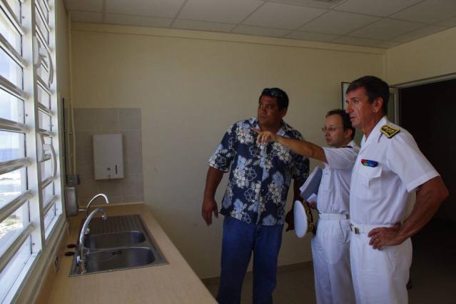 Le Haut-Commissaire a poursuivi son déplacement aux Gambier, où un accueil a été réalisé à l’école primaire. Jean-Pierre Laflaquière a pu à cette occasion visiter la cantine scolaire qui a été construite avec l’aide du Fonds Intercommunal de Péréquation (FIP) à hauteur de 100%. Grâce aux efforts conjugués de la Mairie et de la Direction de l’Ingénierie Publique et des Affaires Communales (DIPAC) qui a suivi le projet, les élèves de l’école élémentaire et primaire peuvent désormais déjeuner dans des conditions optimales.