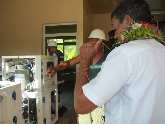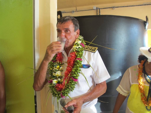 La visite s’est poursuivie par le centre de production d’eau potable. L’ouverture officielle du service de distribution d’eau potable une fois que les tarifs auront été fixés par une délibération communale. L’opération, d’un montant global de 61 M F CFP, a été financée par le fonds intercommunal de péréquation (FIP pour 18.44%) et par le Contrat de projets (financement 35% Etat, 35% Pays). Cette installation permettra à la commune d’être en règle vis-à-vis des obligations de distribution d’eau potable avant 2015.