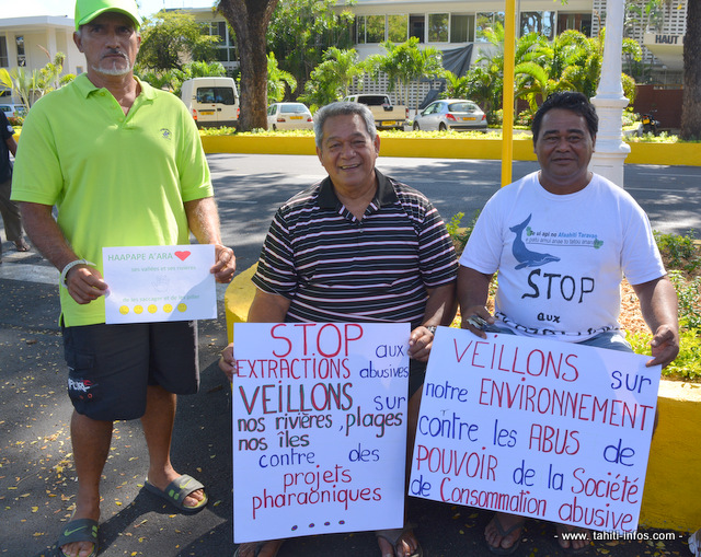 PAPEETE, le 19 septembre 2014. Des propriétaires terriens de la vallée de la Tevaifaara, une rivière de Mahaena sur la commune de Hitiaa O Te Ra (côte Est de Tahiti) se sont rendus, en nombre, au Palais de Justice de Papeete, ce vendredi matin, pour soutenir deux des leurs convoqués devant le juge des référés. Les deux hommes étaient cités au tribunal pour avoir bloqué le passage d’une servitude aux camions et aux engins d’une société effectuant des opérations d’extraction de matériaux dans le lit de la rivière Tevaifaara. A l’extérieur du tribunal des banderoles et des pancartes étaient déployées pour dénoncer ces extractions dans les rivières de Polynésie.