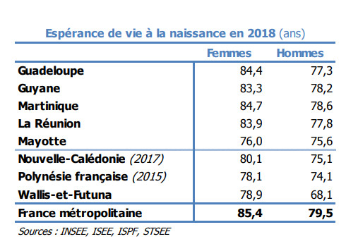 Seule l’île de Mayotte affiche un taux d’espérance de vie inférieur à celui de la Polynésie. En Guadeloupe, le taux d'espérance de vie à la naissance atteint 74 ans pour les hommes et 84 ans pour les femmes, soit six ans de plus que les Polynésiennes, et 77 ans pour les Guadeloupéens, soit trois ans de plus qu'un homme né en Polynésie.