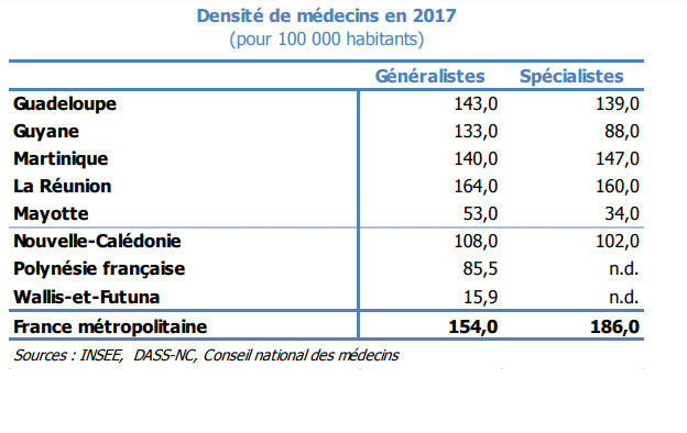 Alors qu'en métropole on compte 154 médecins généralistes pour 100 000 habitants, la Polynésie en enregistrait 85.5 pour le même nombre d'habitants en 2017. La densité de médecins en Polynésie française fait partie des plus faibles de France et de l'outre-mer. À titre d'exemple, la Nouvelle-Calédonie compte 108 et la Guadeloupe 143 praticiens pour 100 000 habitants.