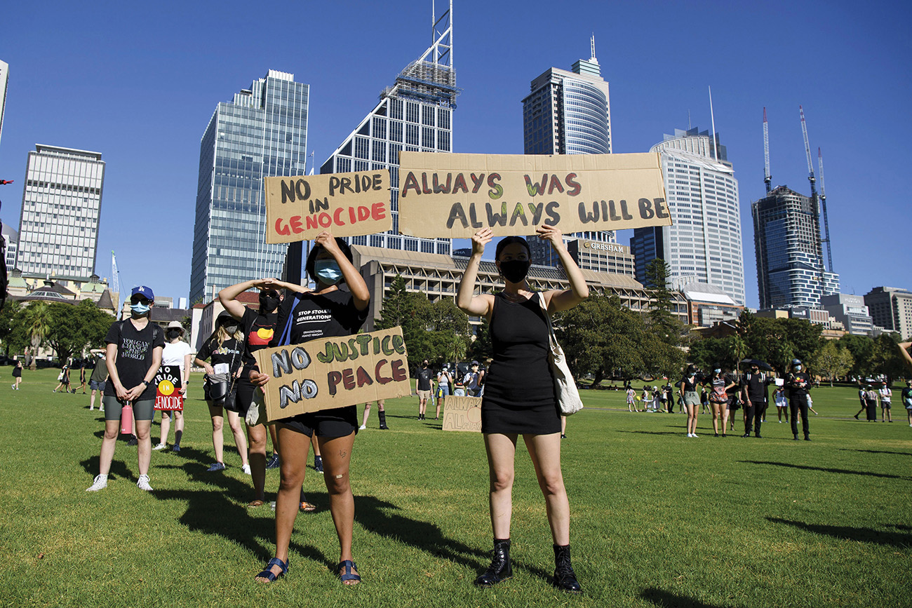 Des milliers de personnes se sont réunies dans le centre de Sydney, malgré les menaces d'amendes et d'arrestation de la police, du fait de l'interdiction des rassemblements de plus de 500 personnes. Les associations organisant généralement les manifestations de cette "Journée de l'invasion" avaient annulé la marche qui a lieu traditionnellement.
