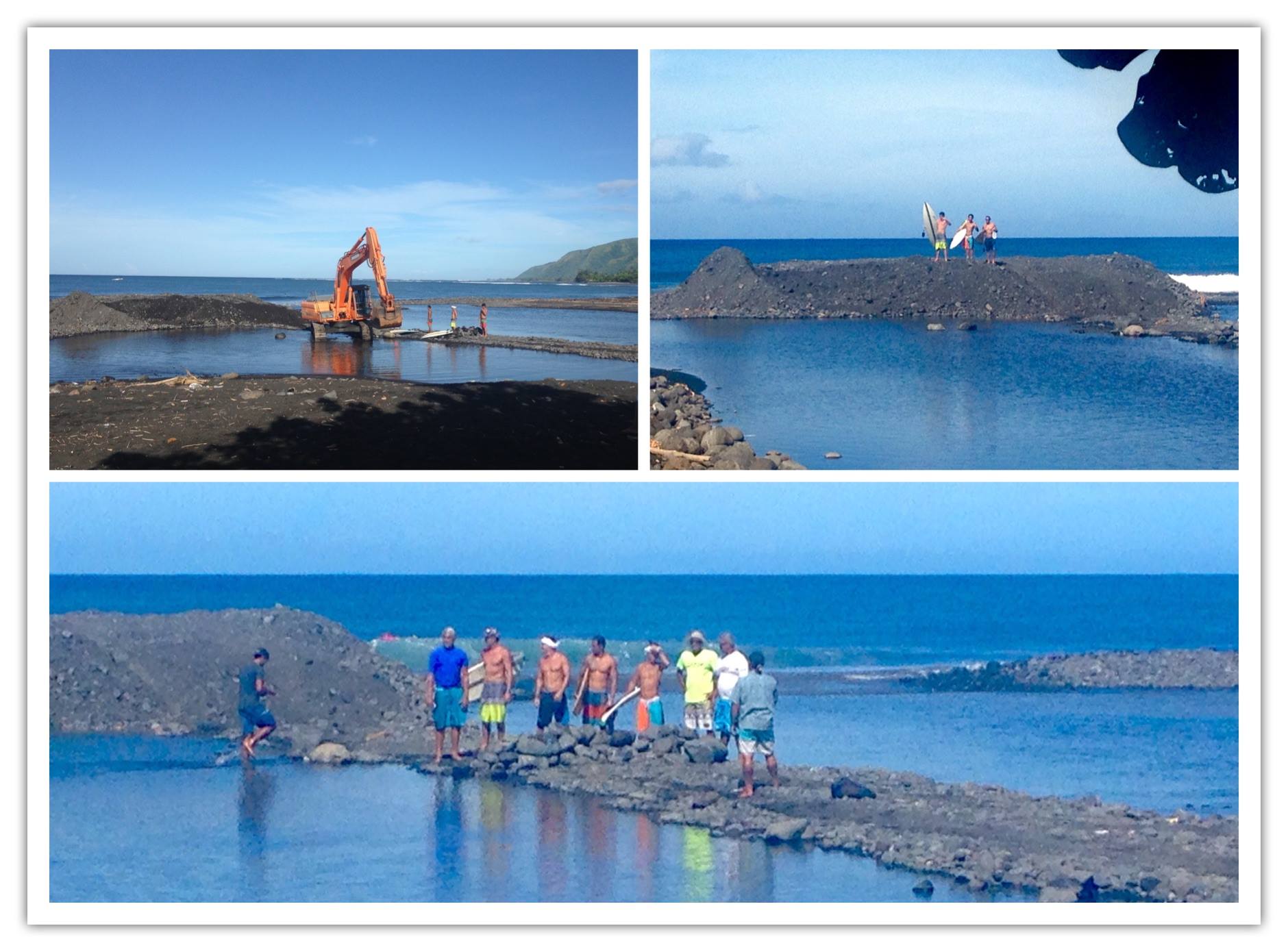 Il n’en fallait pas moins pour qu’Ariihoe lance un appel le soir même sur les réseaux sociaux « Exagéré ! Demain matin, chacun sa pelle et on remet le maximum (ndlr de sable) dans l’eau ! » Le lendemain, mercredi matin très tôt, il a été rejoint par les champions de surf Hira Teriinatoofa et Ralph Sanford qui se sont mis en travers de la pelleteuse pour interrompre les travaux.