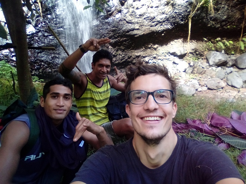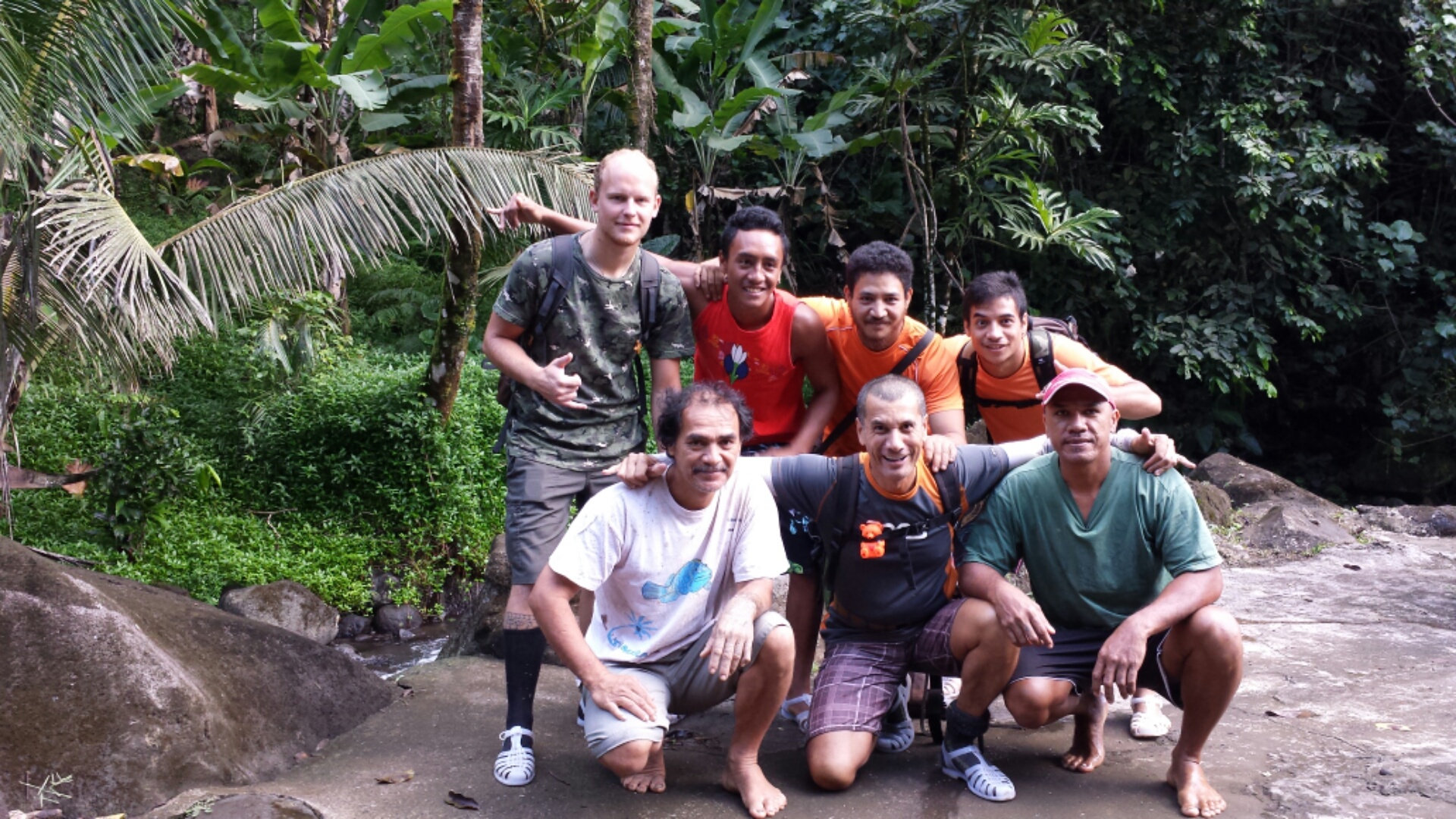 Melvin Pirard, volontaire belge à Fatu Hiva (entouré de l'équipe de Manu)