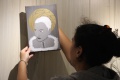 Yvenka Klima, diplômée 2019, porte un tableau noir sur lequel un symbole doré a été tracé. À ses pieds se trouvent des portraits, expressifs et colorés. "Ce qui m’intéresse c’est de sortir un peu du local. Je fais de l’acrylique, du feutre, du stylo, j’expérimente. Parfois, je me lance sans savoir où je vais et ça prend forme au fur et à mesure."