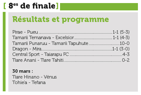 À la 77e minute, c’est cette fois-ci Mathieu Adge, le gardien des bleus, qui a sauvé à deux reprises l’équipe de Papetoai en repoussant d’abord du bout des doigts une frappe croisée de Shawn Tinirauarii, puis, la minute suivante, une balle piquée du même joueur par un geste réflexe. Le gardien de Mira s’est encore illustré à la 88e minute en repoussant par une claquette une tête de Jacques Tetauira. Héroïque jusque-là, la défense de Mira, tenue par l’excellente charnière centrale composée de Teiki Vaea et Heiariki Aléonard, a finalement craqué dans les arrêts de jeu sur une tête de Ariitapu Asen (1-1). Dragon s’est finalement qualifié aux tirs aux buts (3-0) pour les quarts de finale avec notamment trois arrêts déterminants de Jonathan Torohia.