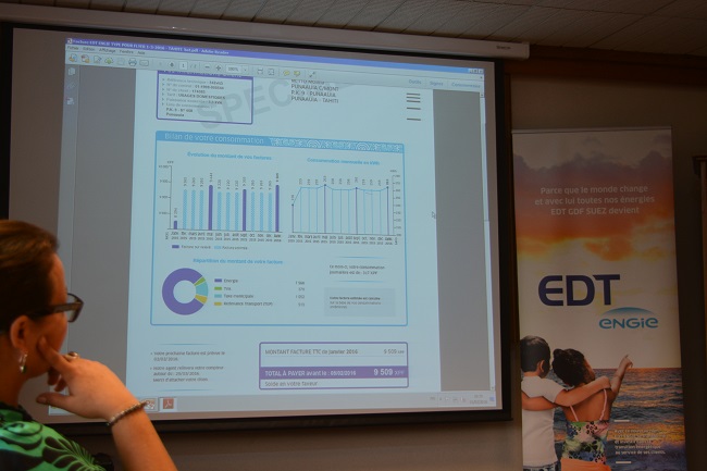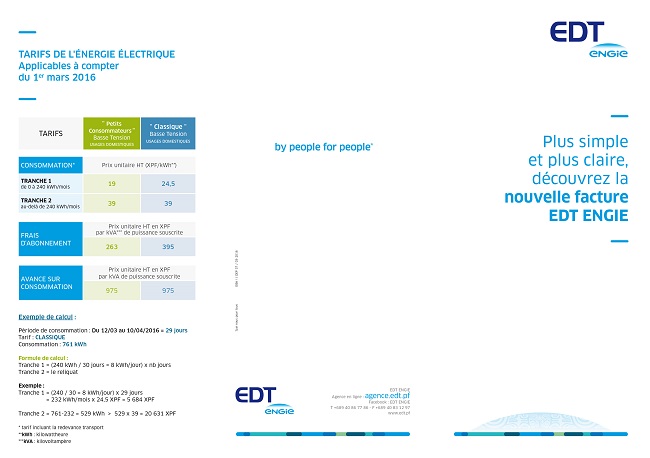 Ce nouveau mode de présentation de la facture a été élaboré par EDT en lien avec un groupe de consommateurs et après un audit mené par une société de conseil indépendante a expliqué Martha Failloux-Siao, chef de service clientèle. La prochaine facture EDT qui va commencer à être distribuée la semaine prochaine a été éditée avec les tarifs en vigueur avant le 1er mars 2016 pour la plus grande partie de la consommation passée, puisque le nouveau prix de l'électricité n'est appliqué qu'à compter de ce mardi.