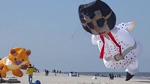 Berck-sur-Mer, France | AFP | lundi 20/04/2015 - Dix-huit mètres de long, un costume blanc et des lunettes noires à monture dorée... Elvis Presley, qui se trémousse nonchalamment au gré du vent dans le ciel bleu, fait sa première sortie en public aux 29e Rencontres internationales de cerfs-volants de Berck-sur-Mer (Pas-de-Calais).