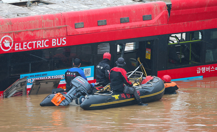 Cheongju, Corée du Sud | AFP | dimanche 16/07/2023 - Au moins 37 personnes ont péri et neuf sont portées disparues après les fortes pluies qui ont provoqué inondations et glissements de terrain en Corée du Sud, ont déclaré les autorités dimanche, les secouristes recherchant toujours des personnes piégées dans un tunnel souterrain inondé.